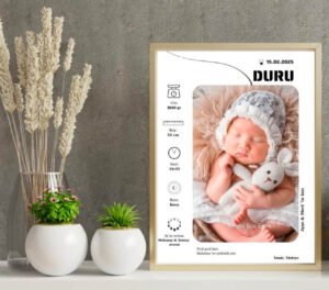 Bebeğin isminin yazılı olduğu posterler hem dekoratif hem de anlamlı bir hatıra olur. Doğum tarihi, kilo ve boy bilgileri eklenen tasarımlar özellikle hediye olarak çok tercih edilir.