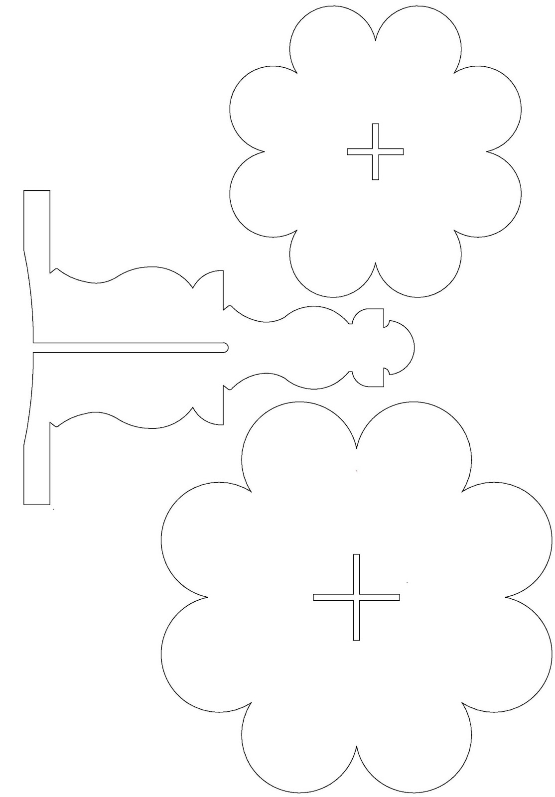 Bu fotoğrafları A3 boyutunda desenli ya da sade bir kağıda basınız. Kalın bir mukavvaya yapıştırın. Tüm şekiller maket bıçağı yardımıyla kesiniz ve toplam 5 adet parça elde etmeniz gerekmektedir. Uzun parçanın tam ortasındaki çizgilerden birbirine geçirerek ayakları oluşturun. Çiçek kalıplarının ortasındaki çizgiyi kesip yerlerine yerleştiriniz.