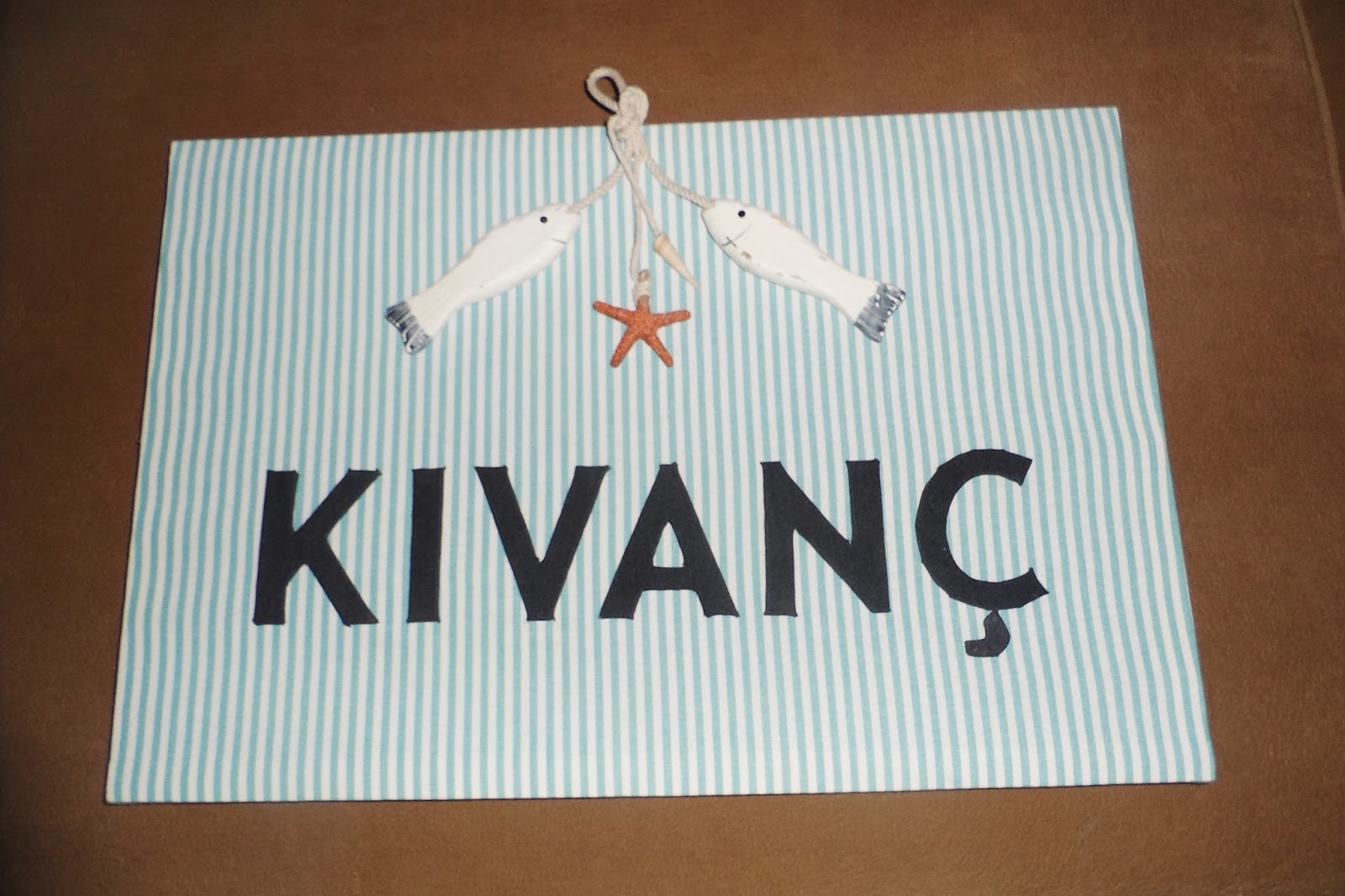 Turkuaz benim vazgeçilmez rengimdir. Bir de çizgili olunca gerçekten şık duruyor. Oğlum için yaptığımız bu kapı süsü balıklar hariç hepsi kumaşlarla yapıldı. Nasıl mı?1. Aşama: 4 tane ince tahta çubukları kare şeklinde birbirine zımbaladık sonrasında kumaş ile kapladık