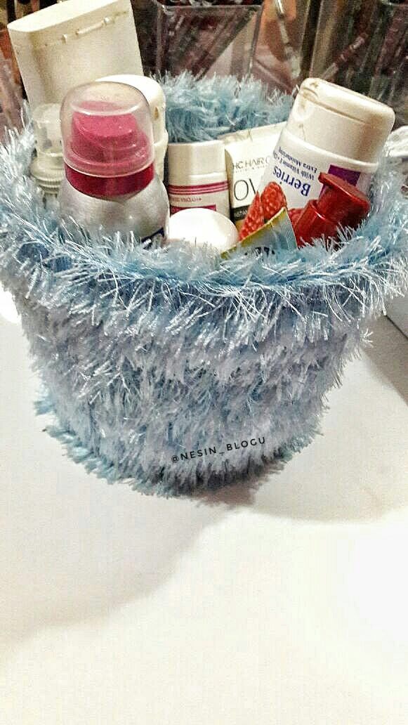Ve kalan malzemeleri de yoğurt kovası ve tüylü iplerden yaptığım kutuya doldurdum.